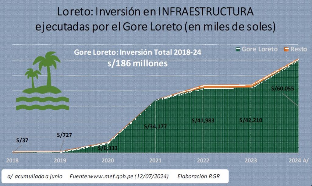 En el periodo 2018 a junio 2024, las inversiones ejecutadas por los tres niveles de gobierno acumularon s/193 millones, de los cuales el Gore Loreto representa el 96 por ciento (s/186 millones), siendo su proyecto emblemático la Construcción de la Marina Turística con una inversión acumulada de s/72.2 millones, de los s/94 millones programadas. Obra en construcción desde el 2020. El segundo proyecto emblemático es el Boulevard de Iquitos con una inversión acumulada de s/38 millones, obra aún no liquidada. Ambos proyectos de obra en infraestructura turística suman s/132 millones, que representa el 71 por ciento de la inversión total del Gore Loreto.