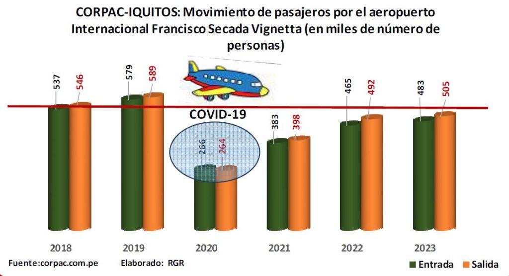 En el periodo 2018 junio 2024, los pasajeros que ingresaron por el aeropuerto internacional coronel FAP Francisco Secada Vignetta al 2023 con 483 mil arribos, número inferior a 2018 (537 mil) y 2019 (579 mil) años previos al año pandémico del Covid-19 (2020), y desde entonces los números no recuperan sus posiciones anteriores a pesar de los esfuerzos institucionales y promocionales por tratar de posicionar un calendario de festividades y actividades locales a quienes gusten Amazonia con su naturaleza viva, y toda esa riqueza de atractivos deslumbrante, no explota ni es descubierta por potenciales turistas.